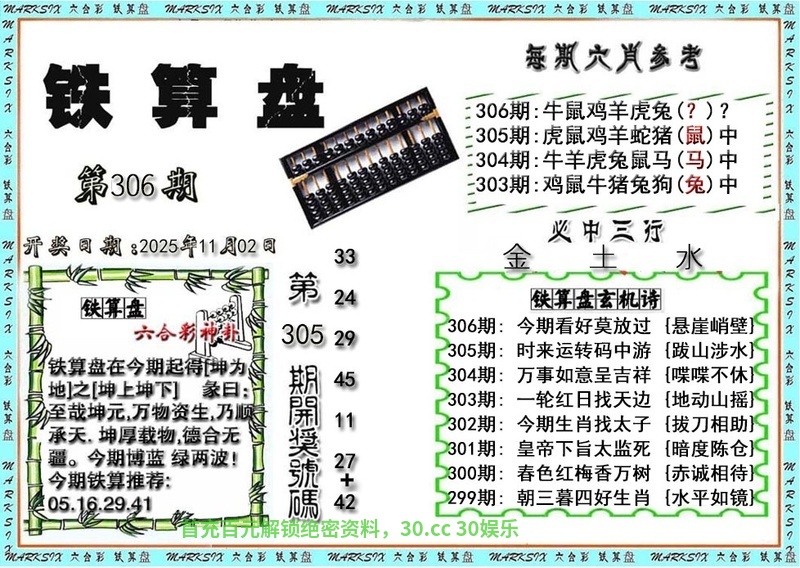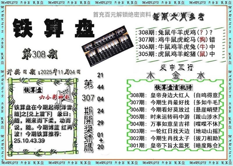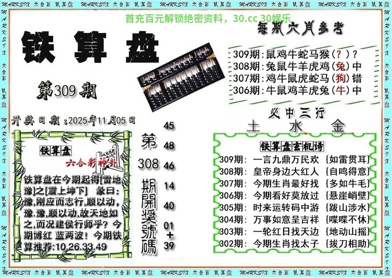 | 308期:神算三行【金火木】开:兔39中 |